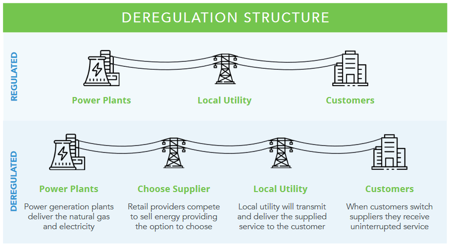 In deregulated energy markets, customers retain their existing infrastructure for energy delivery — the same wires and poles. Even their billing process typically remains unchanged. The primary difference is the destination of the customer’s payments for energy generation. When customers switch their service from the local utility to an alternative electricity provider, the payment for the generation of their electricity is redirected to their chosen provider.